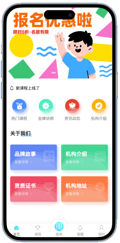 聚合机构介绍/荣誉资质/优秀学员展示,嵌入视频展厅与学员录取榜,强化专业形象。